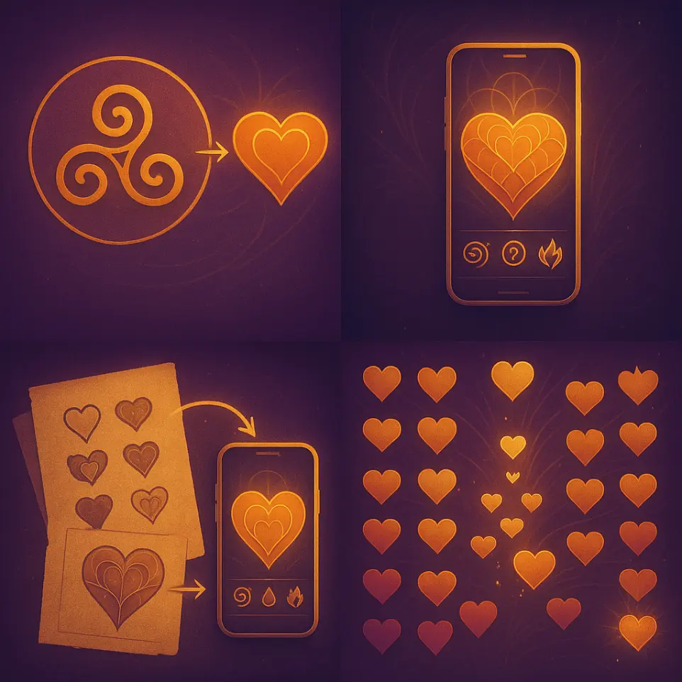 Początkowo była to koncepcja zestawu medytacji przypisanych do różnych aspektów serca. Z czasem projekt urósł do aplikacji mobilnej, łączącej fraktalną symbolikę, duchowe archetypy i śledzenie postępów.